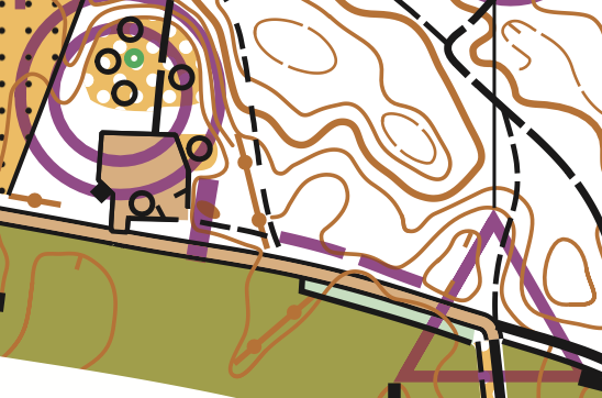 Hinweise zum Ablauf: Kartenausgabe am Ziel. Die Läufer gehen selbstständig zum Startposten („violetter Balken“ auf der Karte, Startposten stempeln). Für Bahn CD sind die beiden Teilbahnen C und D auf Vorder- und Rückseite gedruckt. Die Laufreihenfolge kann frei gewählt werden. Nach der ersten Teilbahn wird der SI-Chip im Ziel ausgelesen. Vor dem Start auf die zweite Bahn den SI-Chip Löschen/Prüfen und nochmals den Startposten stempeln.